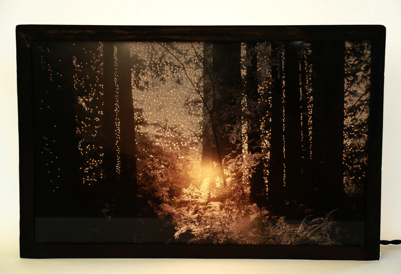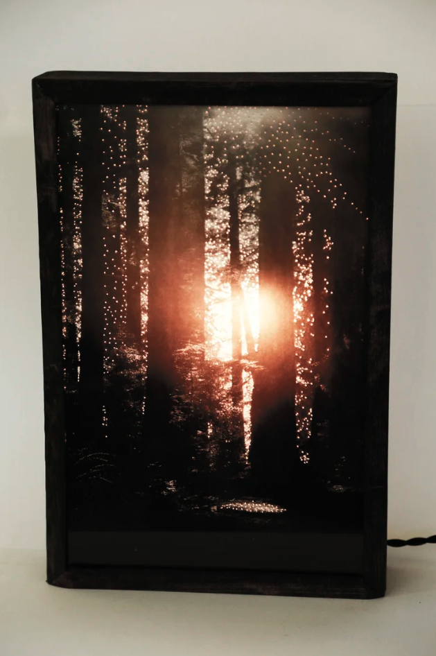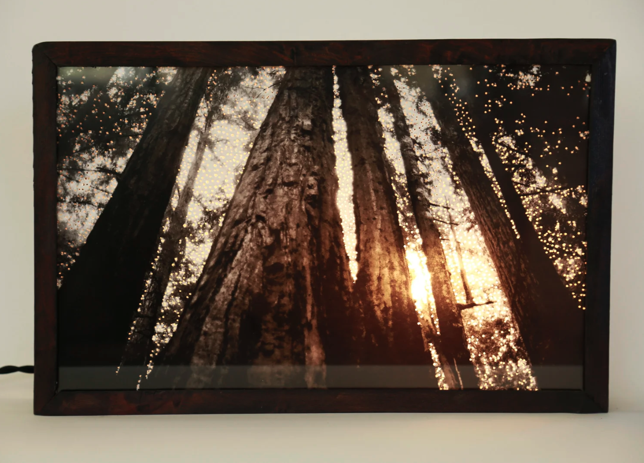 Original photographs taken in the magnificent Coastal Redwood forests of Northern California transformed into modern lanterns, The lightboxes are encased in handmade salvaged Redwood frames and backlit with a dimmable LED bulb. They easily plug into any 2-prong outlet and feature a cloth wrapped, antique-style cord.